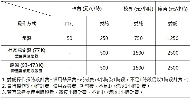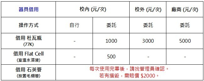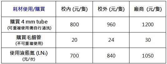 - 委託操作採時段計費+借用器具費+耗材費 (3小時為1時段,不足1時段仍以1時段計費。)
